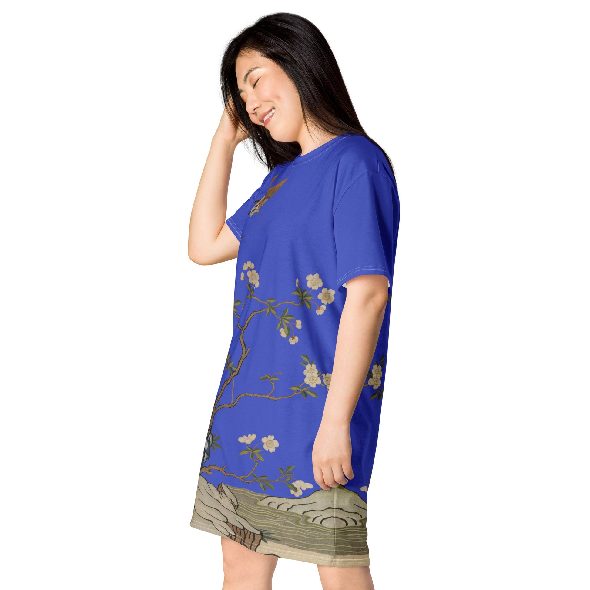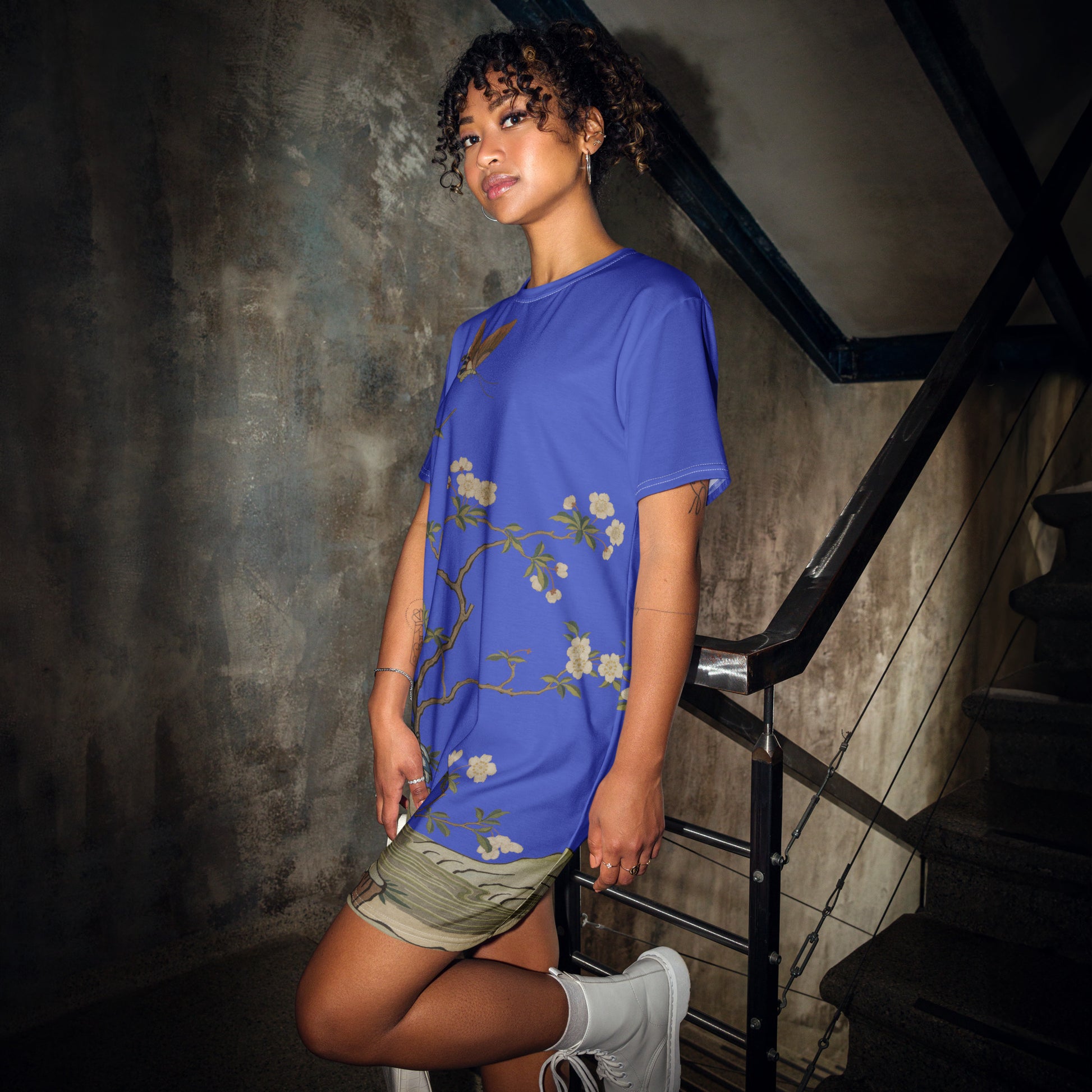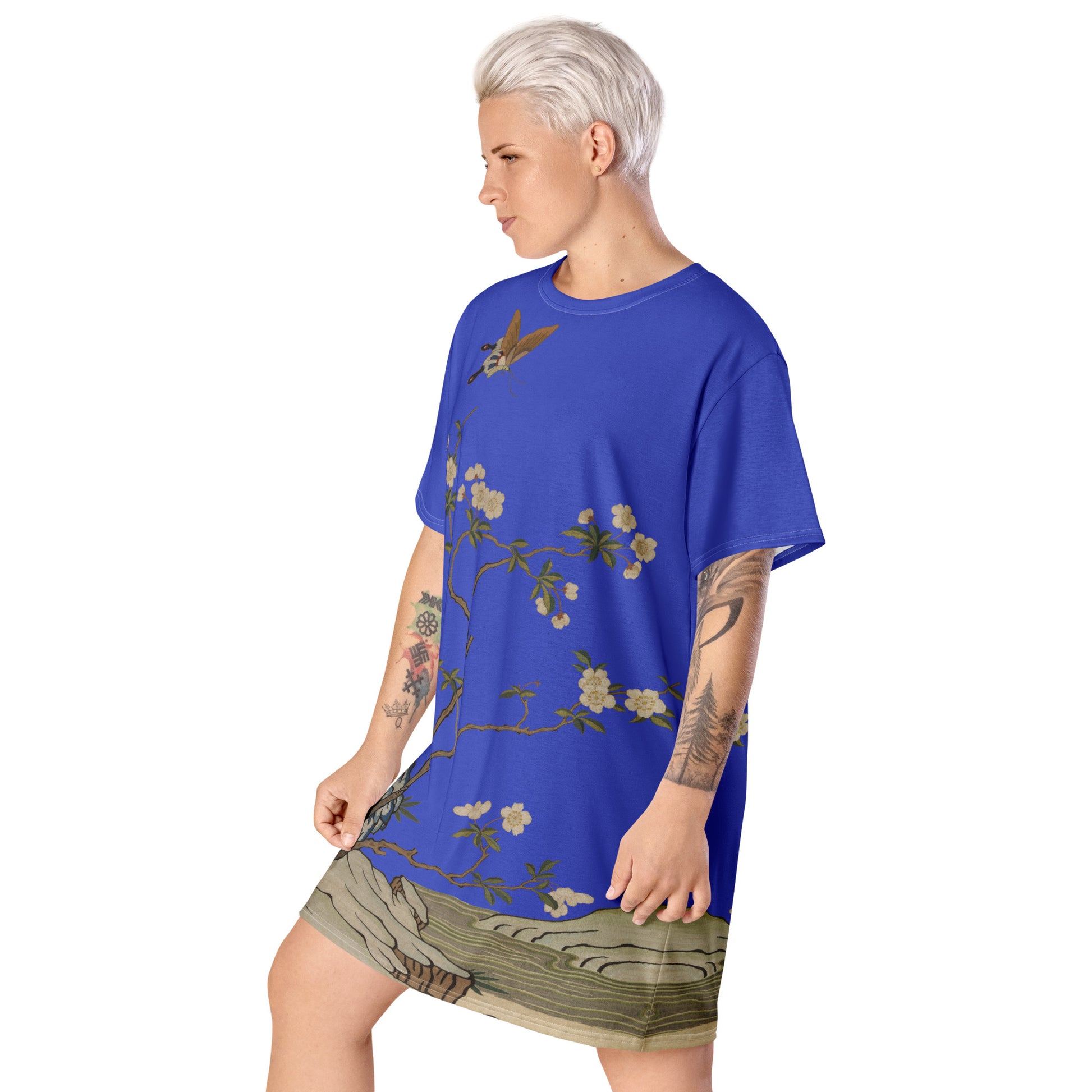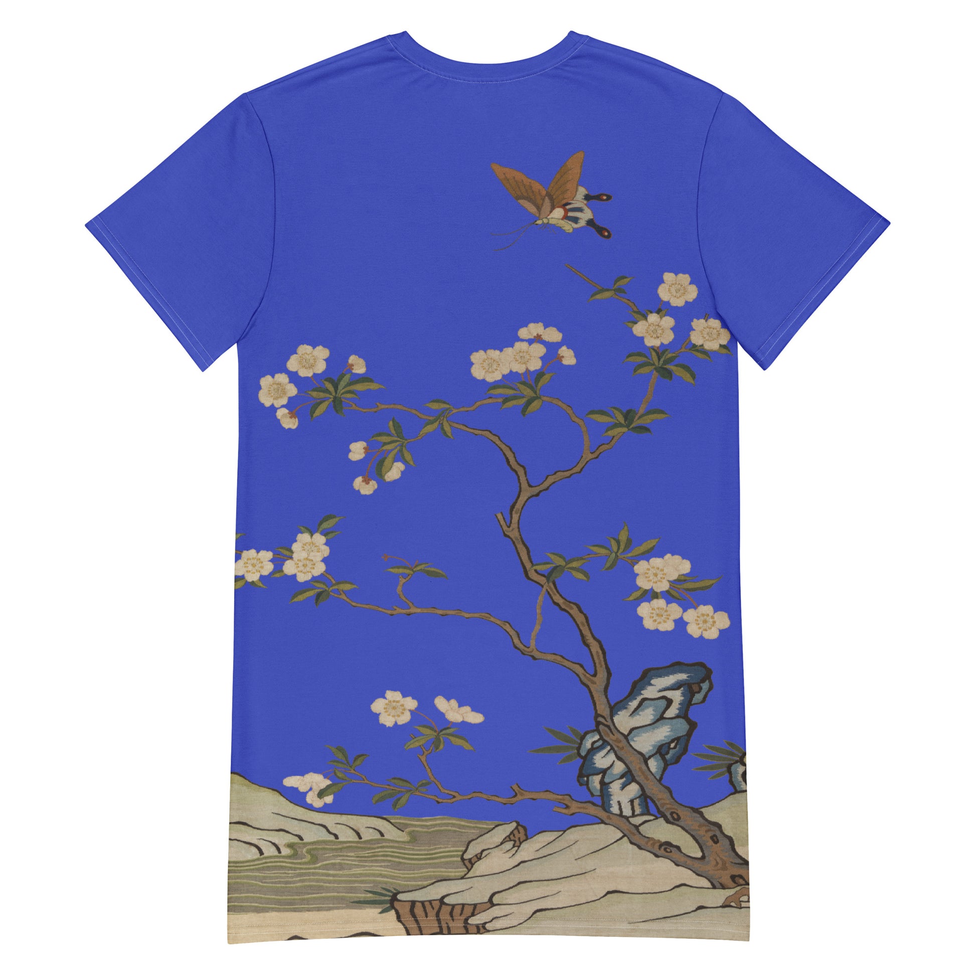 タペストリーの花|梅の花と蝶|Tシャツドレス|ロイヤルブルー