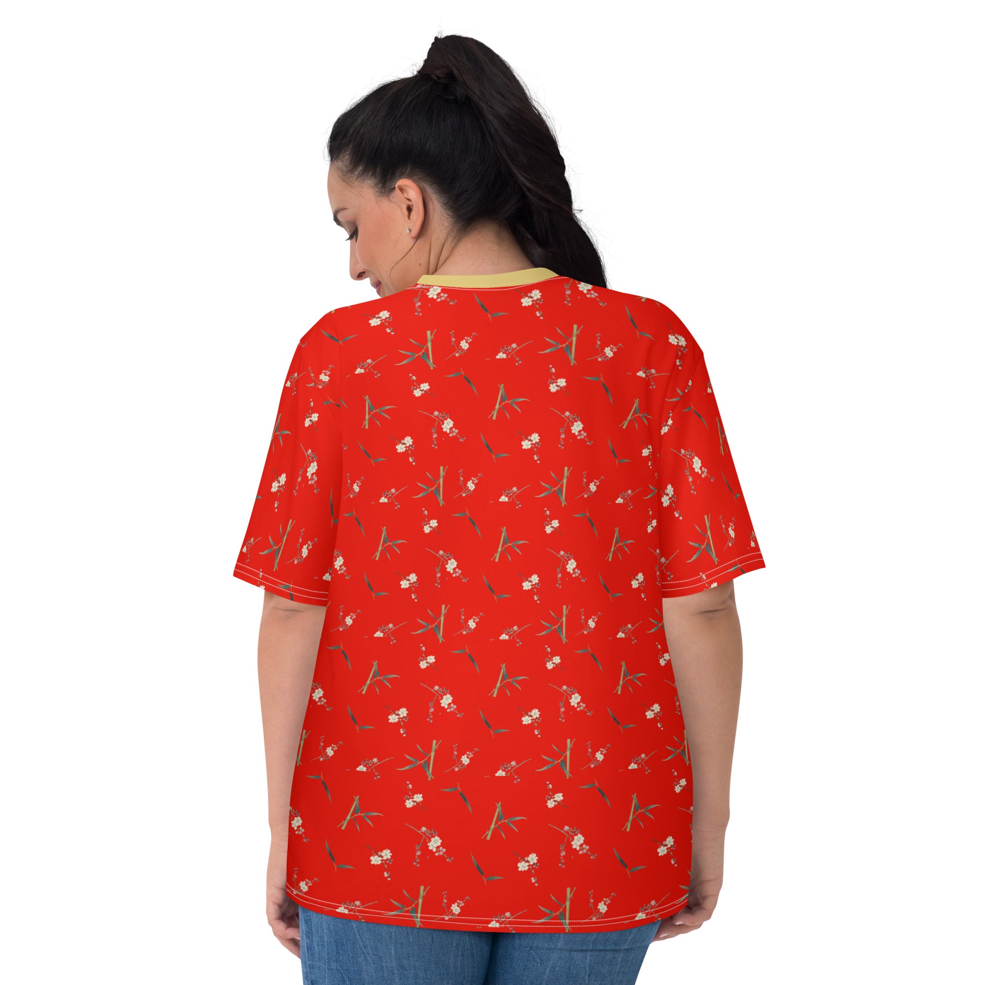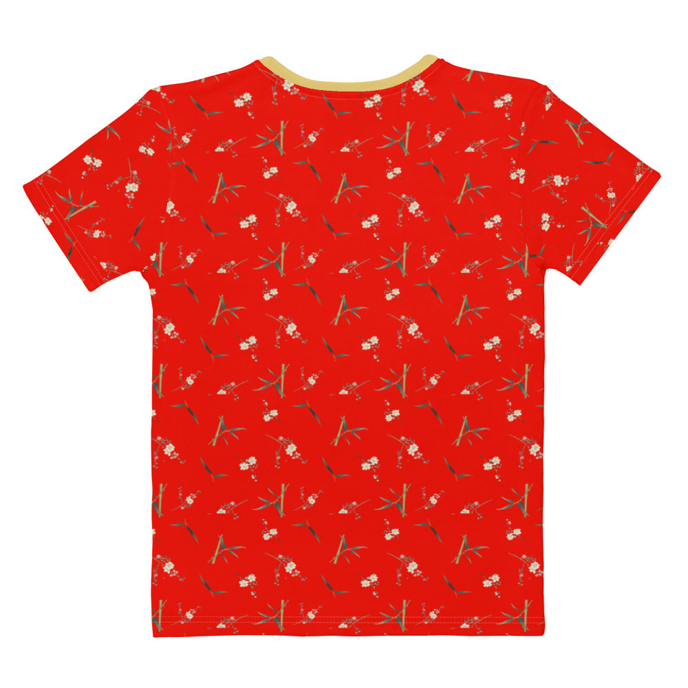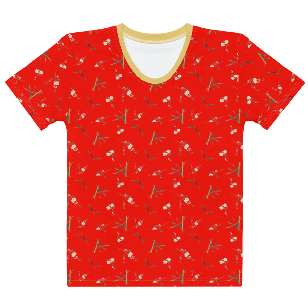 The Spirit of Flowers in Twelve Months|Crimson Plum Blossom and Lush Green Bamboo|Ladies T-shirt|seamless print|Garnet red