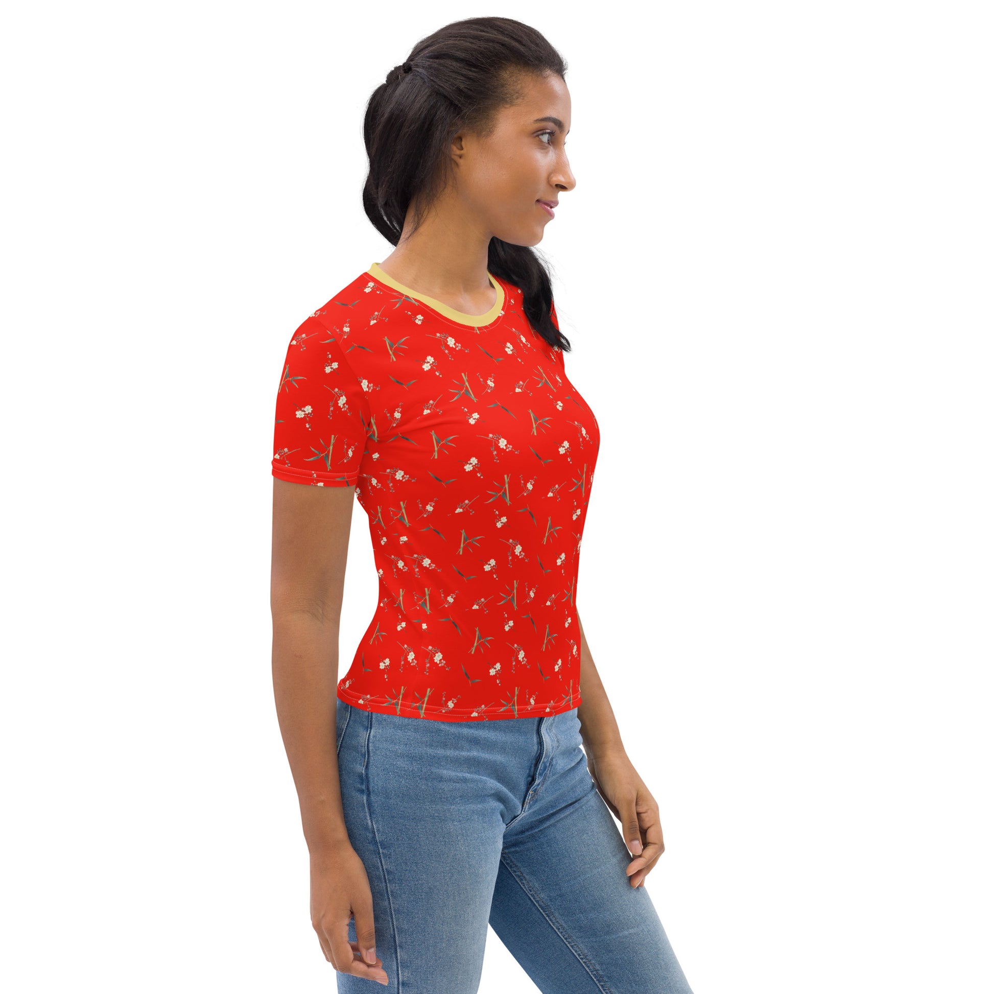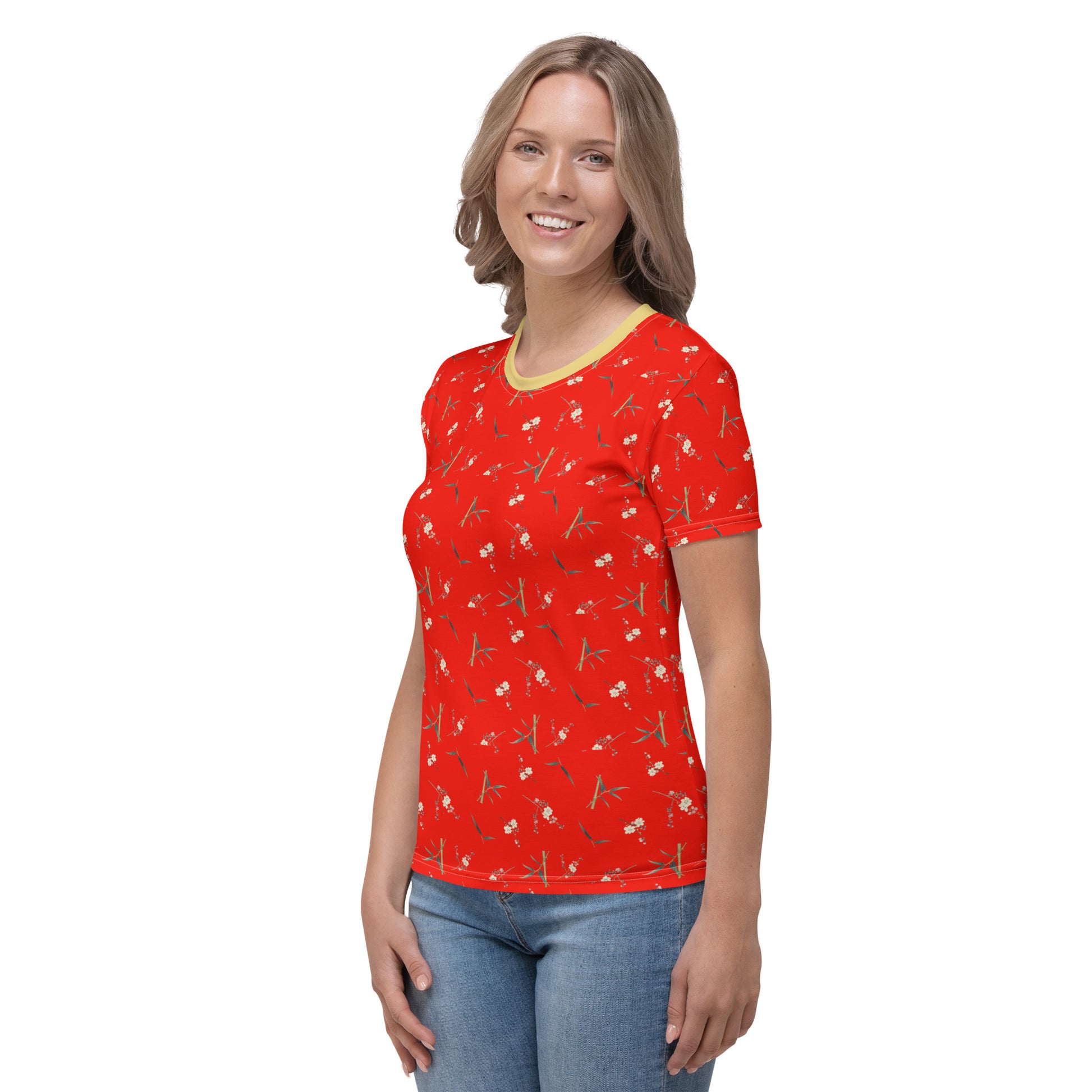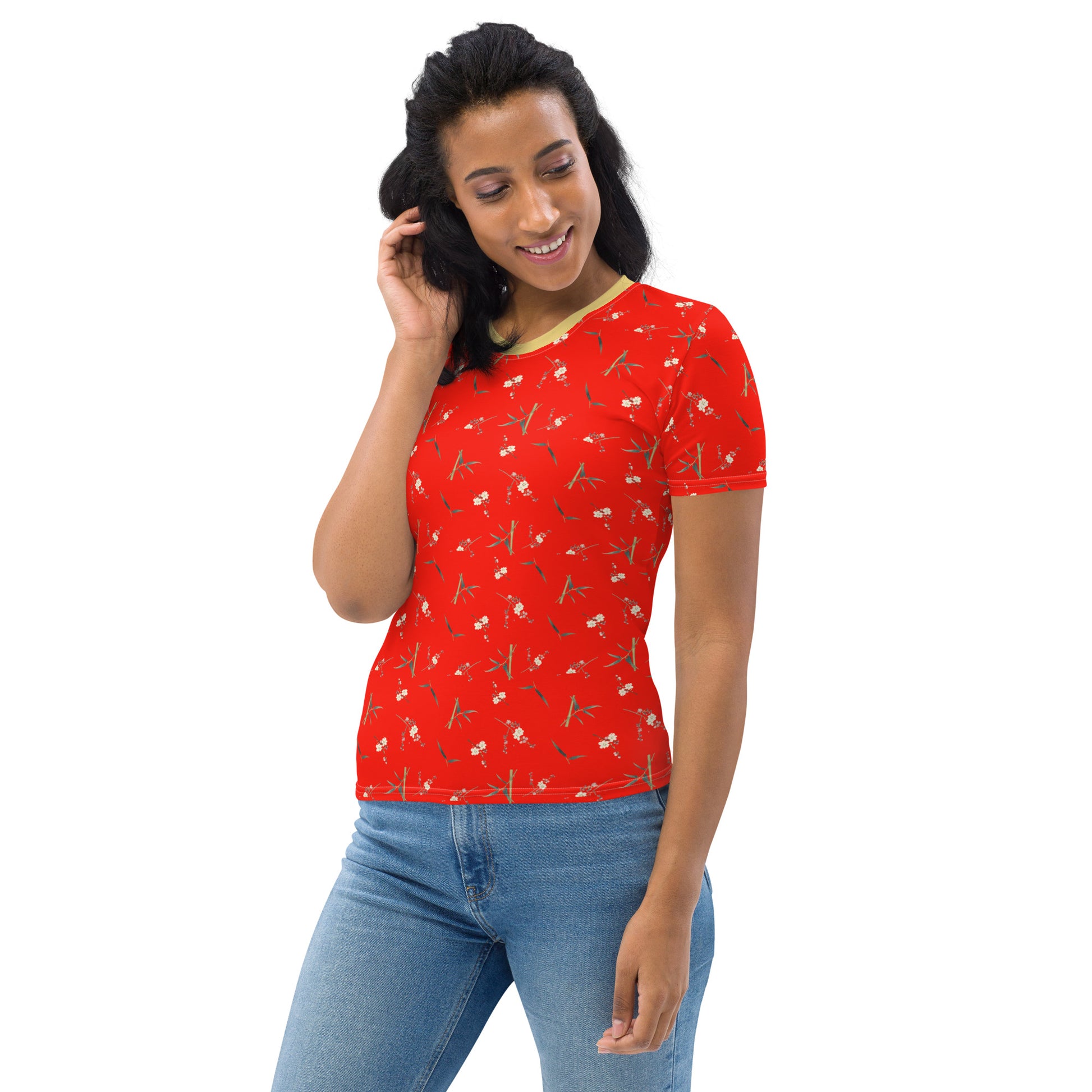 The Spirit of Flowers in Twelve Months|Crimson Plum Blossom and Lush Green Bamboo|Ladies T-shirt|seamless print|Garnet red