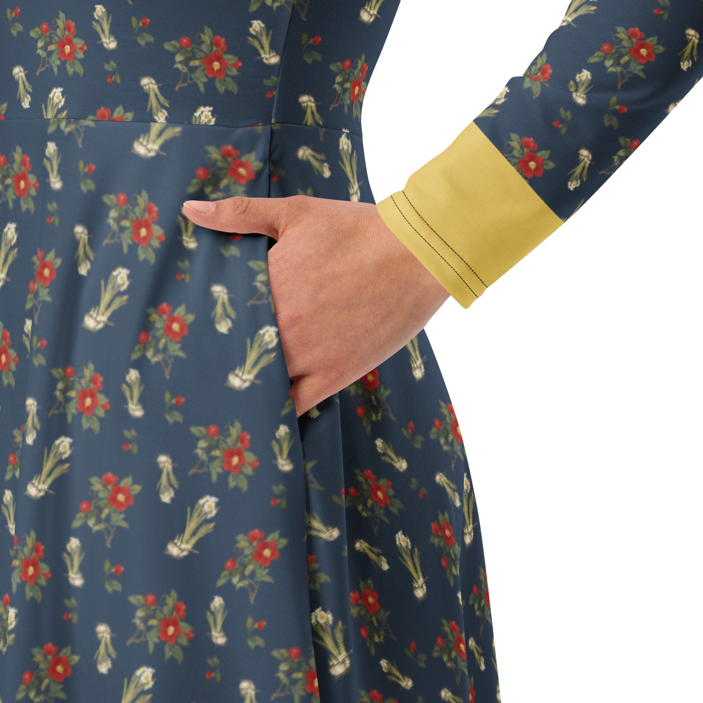 十二月花神|水仙与山茶盛放|长袖中长连衣裙|无缝印花|黛蓝