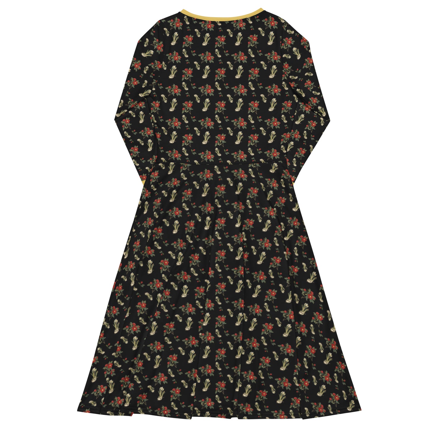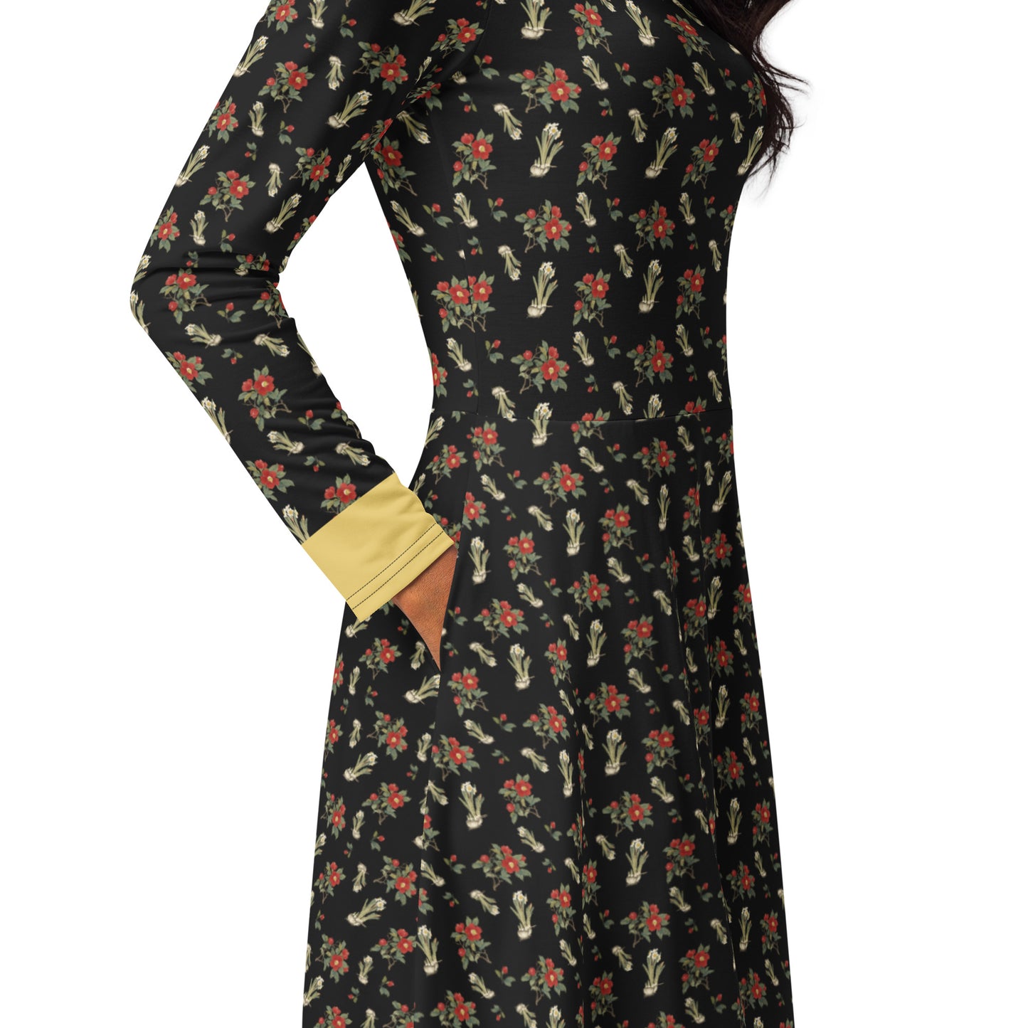 十二月花神|水仙与山茶盛放|长袖中长连衣裙|无缝印花|黑色