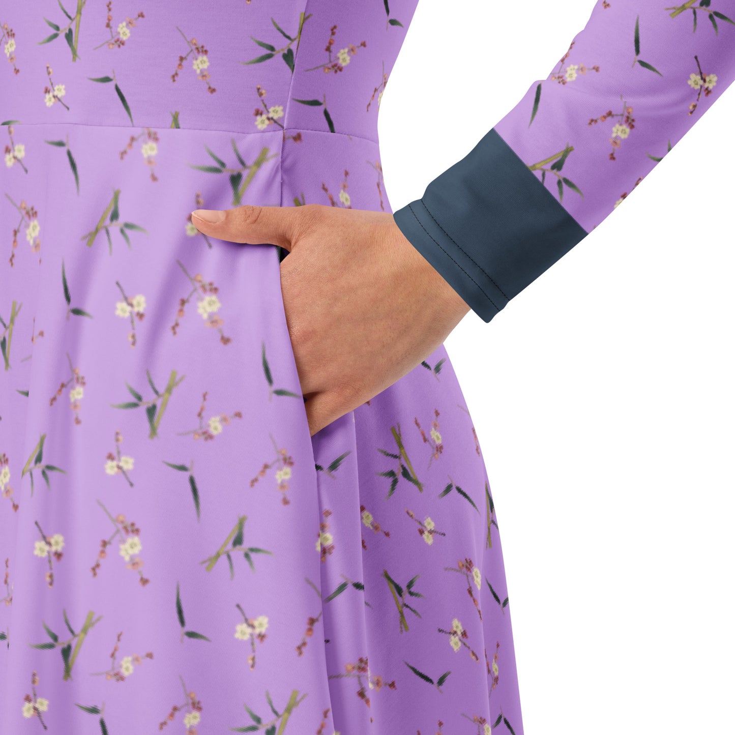 十二月花神|红梅与翠竹|长袖中长连衣裙|无缝印花|淡紫色